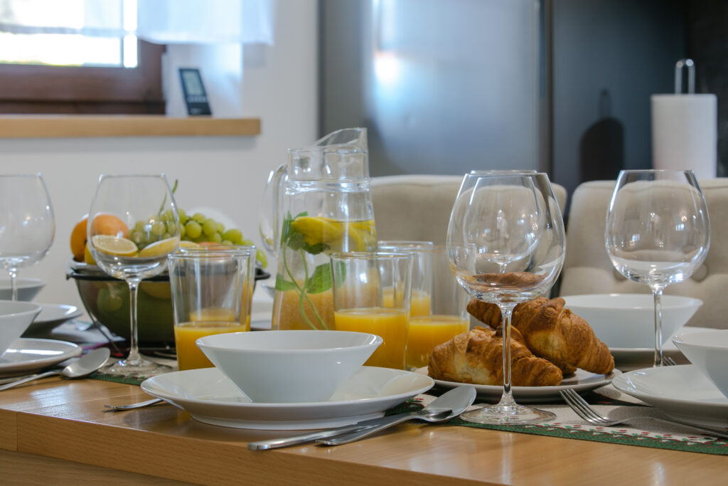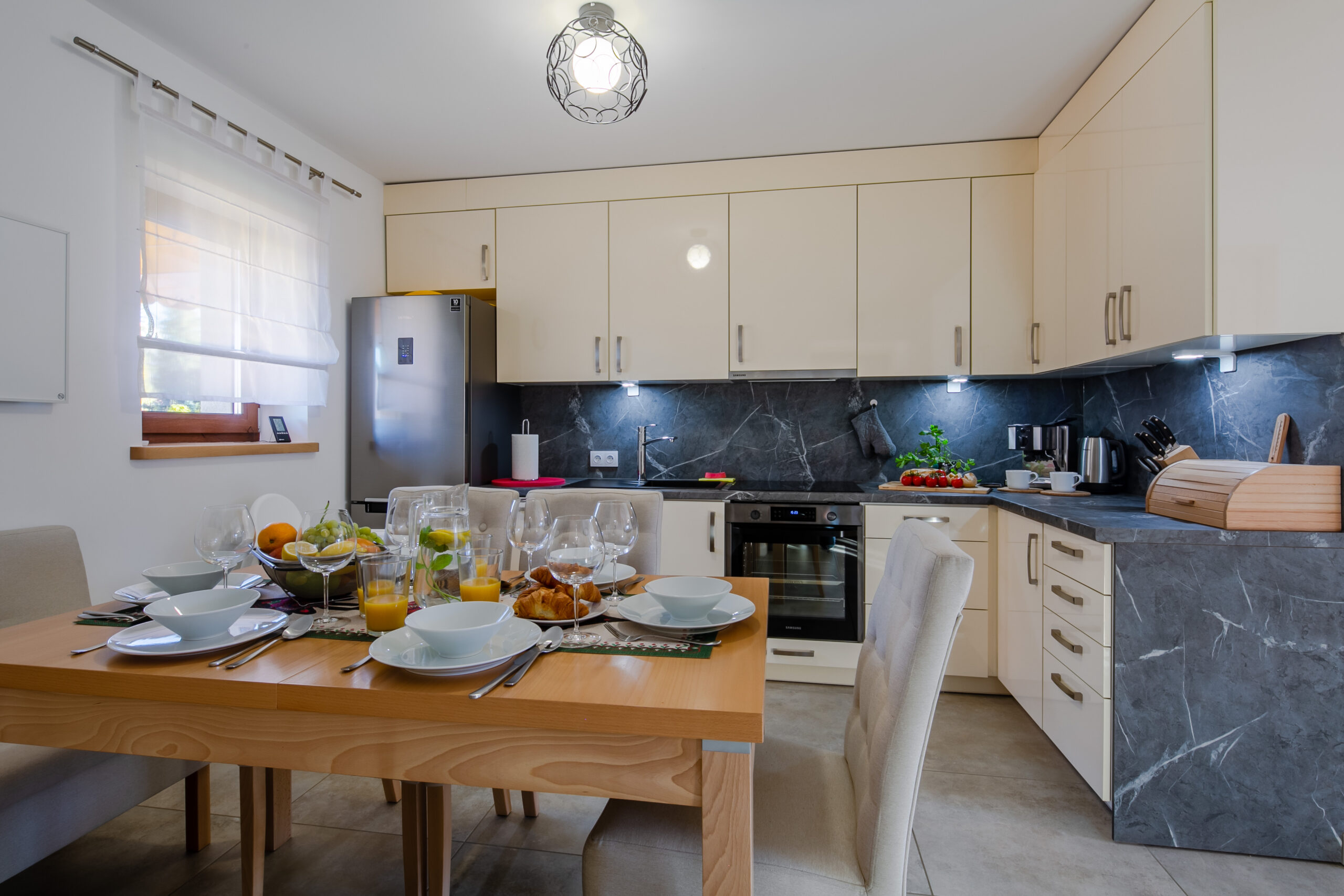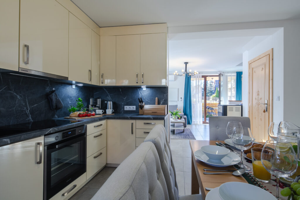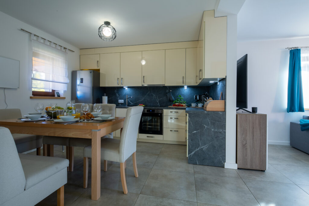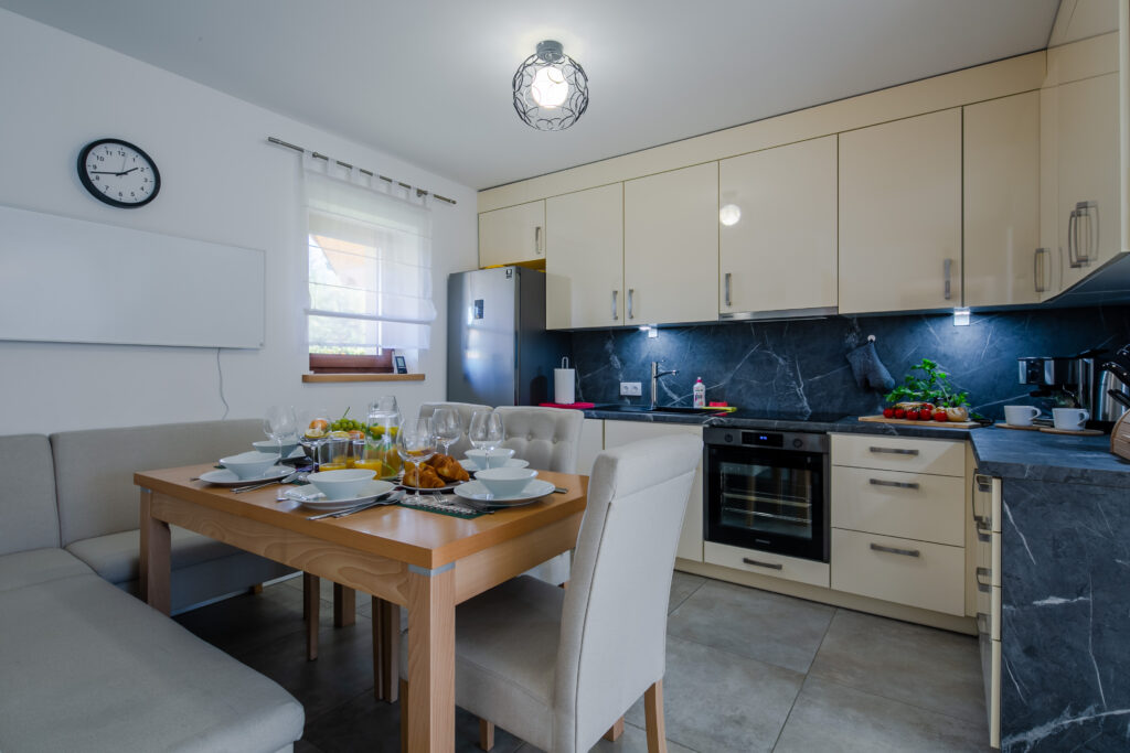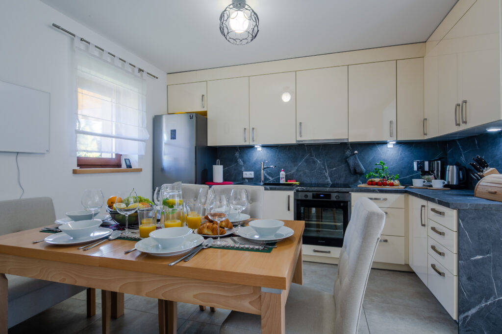 Aneks kuchenny: stół jadalniany z miejscem do siedzenia dla 6 osób, lodówka, zmywarka, płyta elektryczna, okap, czajnik elektryczny, kuchenka mikrofalowa, piekarnik, ekspres do kawy, naczynia, zastawa kuchenna i szklana, fotelik do karmienia dla dziecka.