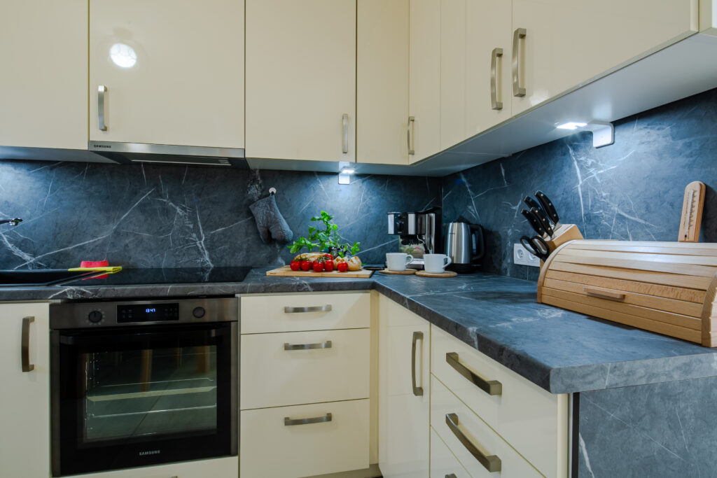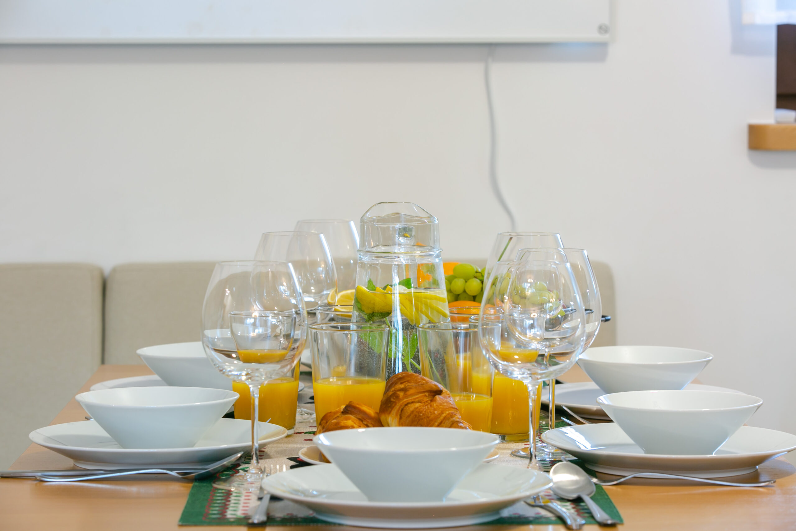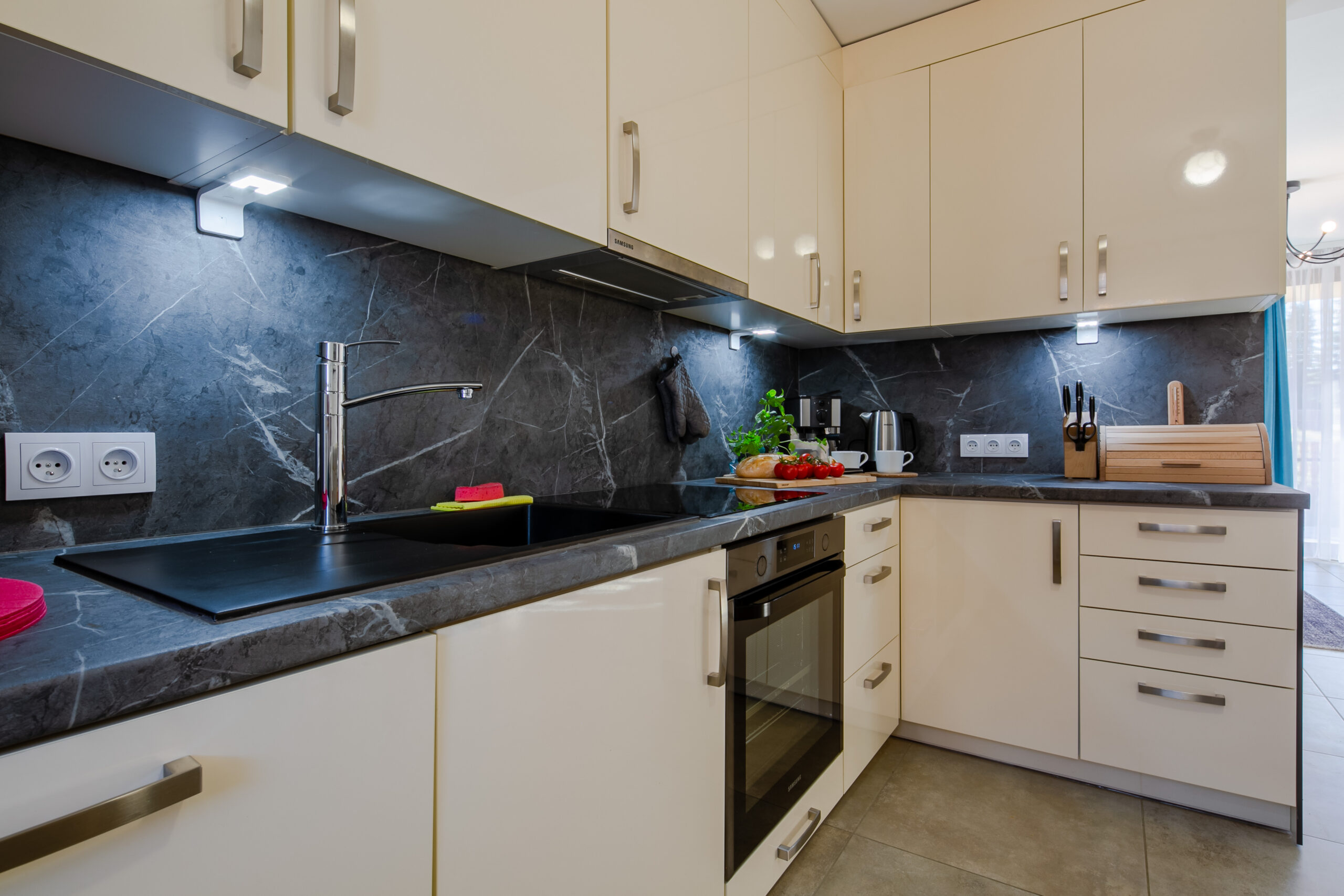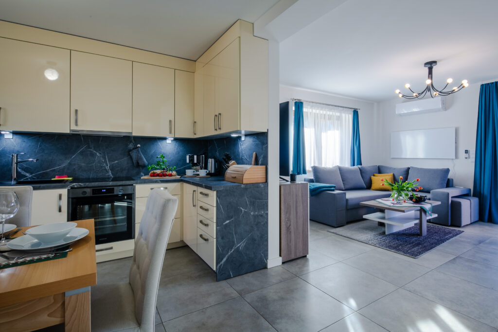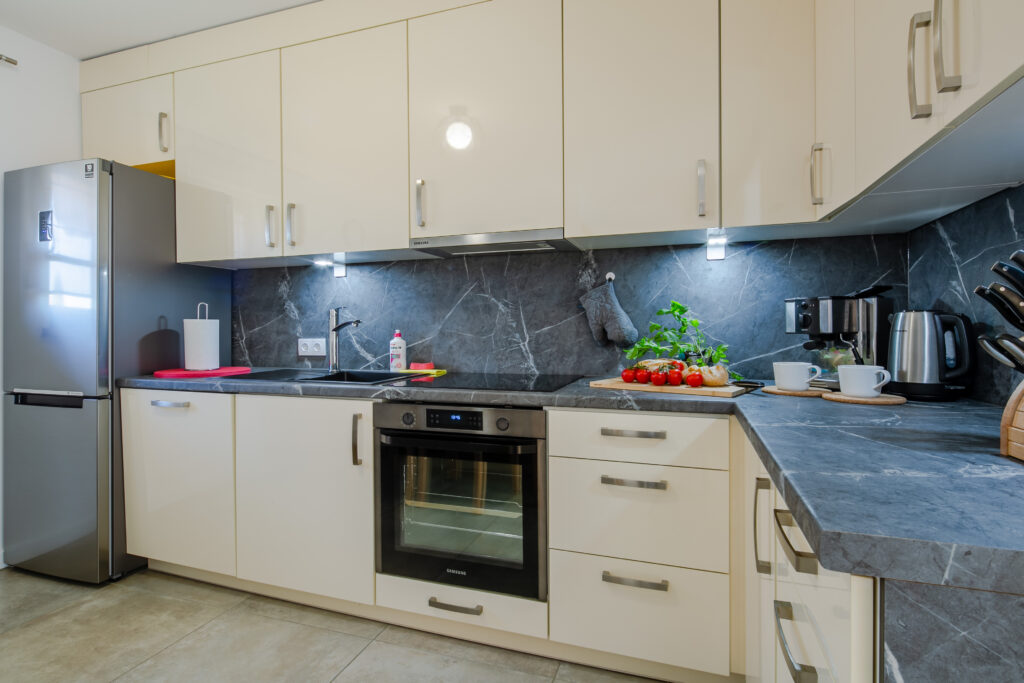 Aneks kuchenny: stół jadalniany z miejscem do siedzenia dla 6 osób, lodówka, zmywarka, płyta elektryczna, okap, czajnik elektryczny, kuchenka mikrofalowa, piekarnik, ekspres do kawy, naczynia, zastawa kuchenna i szklana, fotelik do karmienia dla dziecka.