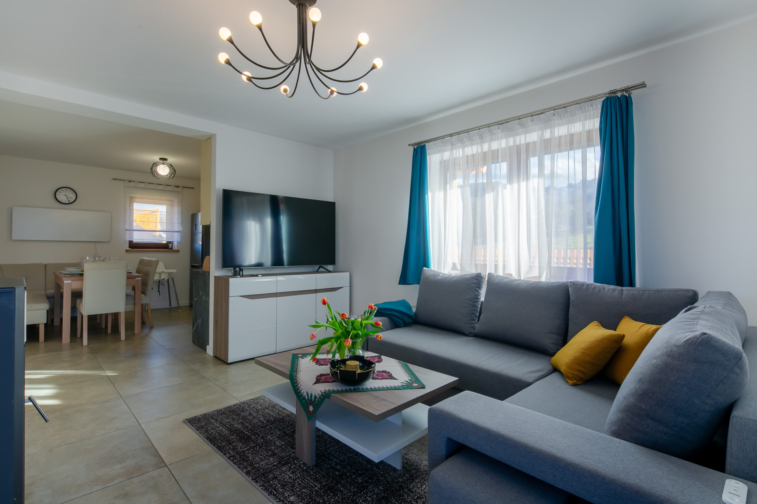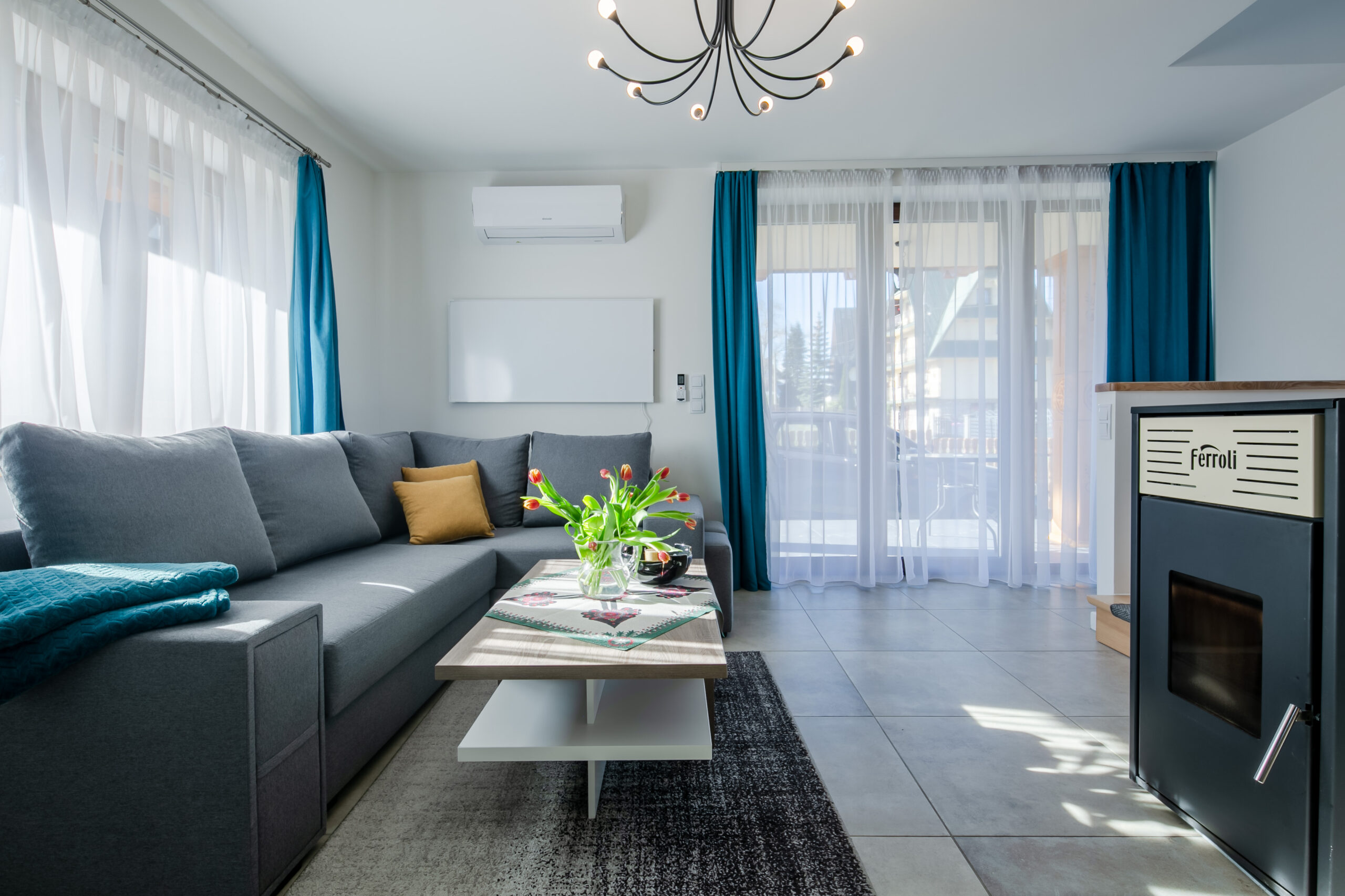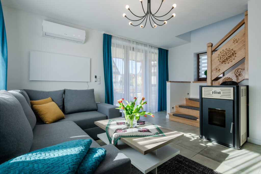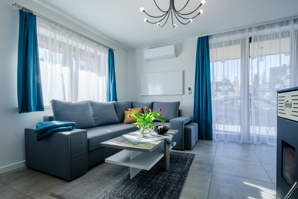Salon: rozkładany narożnik z miejscem do spania dla 2 osób, stolik kawowy, TV’50, Smart TV, kominek z funkcją ogrzewania, wyjście na taras.