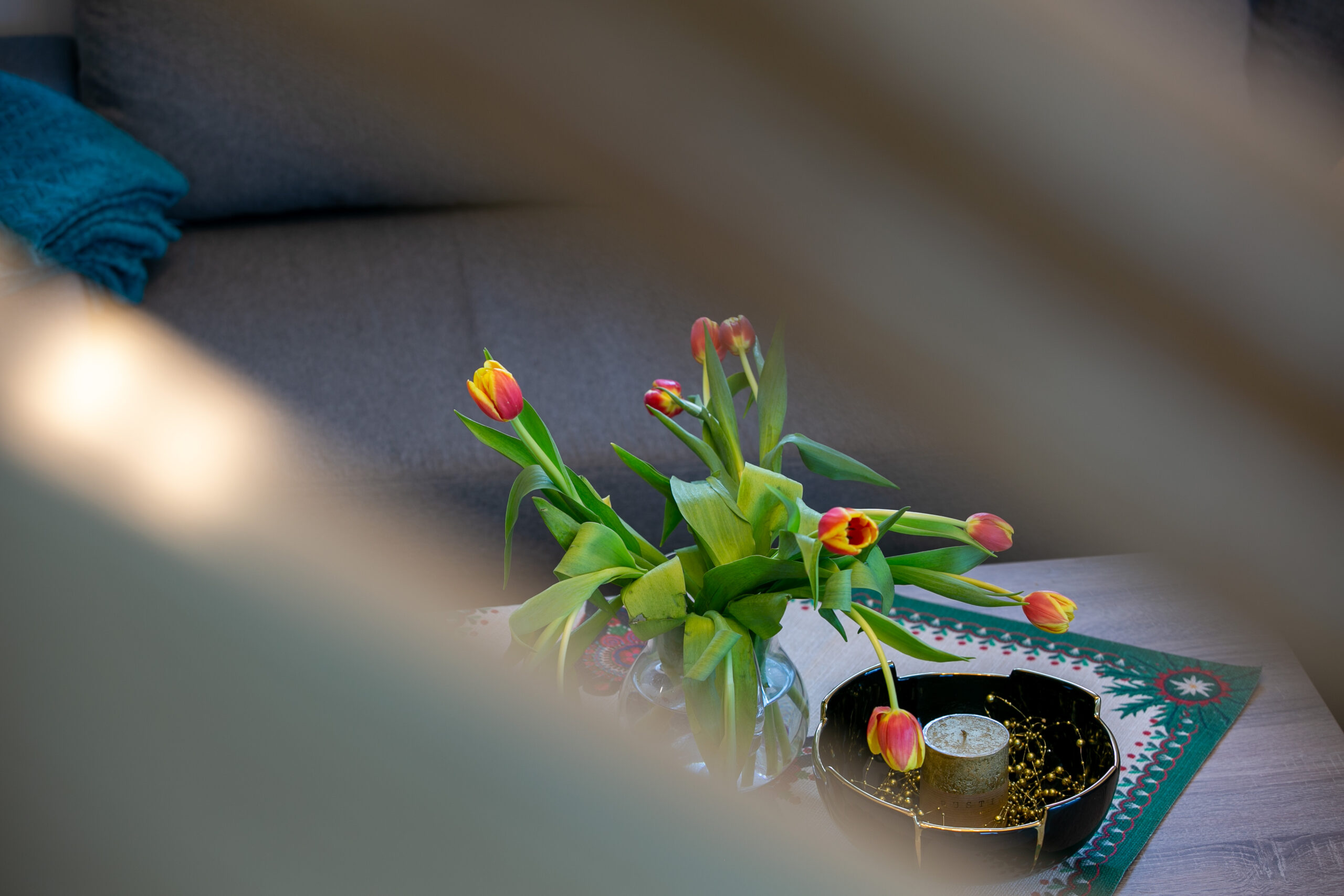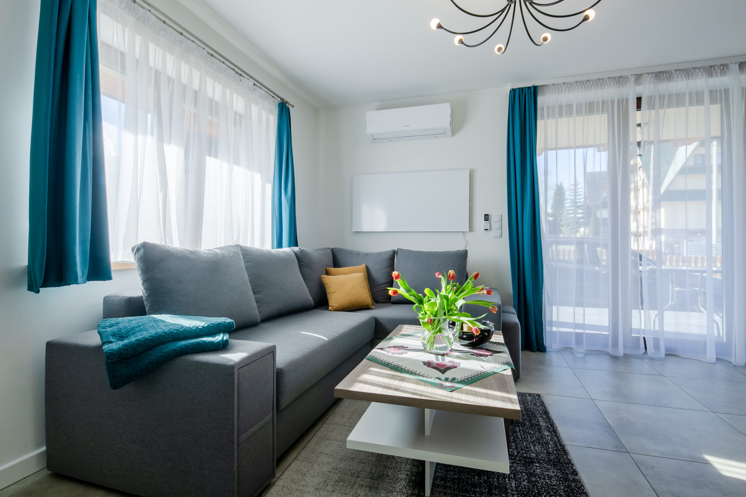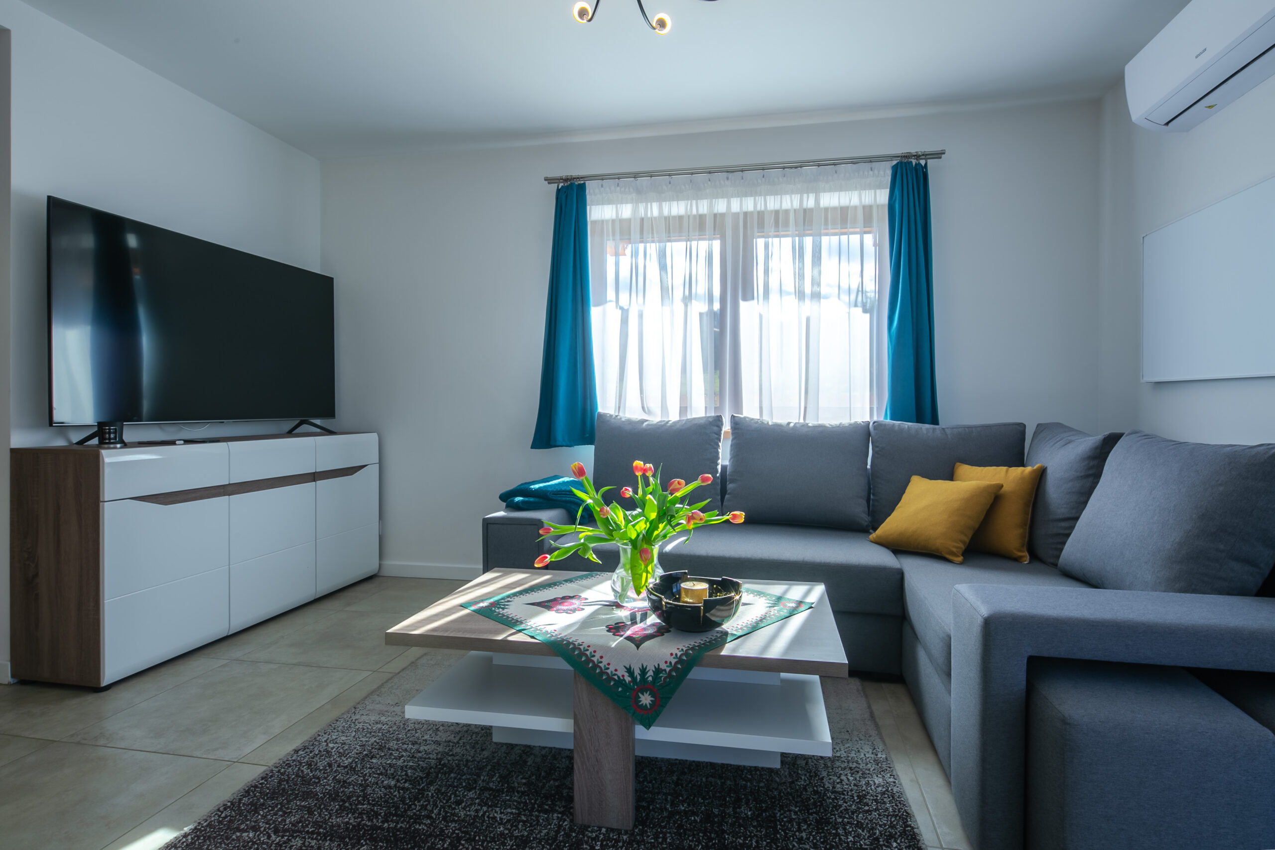 Salon: rozkładany narożnik z miejscem do spania dla 2 osób, stolik kawowy, TV’50, Smart TV, kominek z funkcją ogrzewania, wyjście na taras.