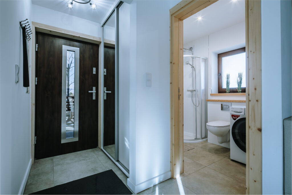 Przedpokój: szafa przesuwna z lustrem, żelazko, odkurzacz, deska do prasowania