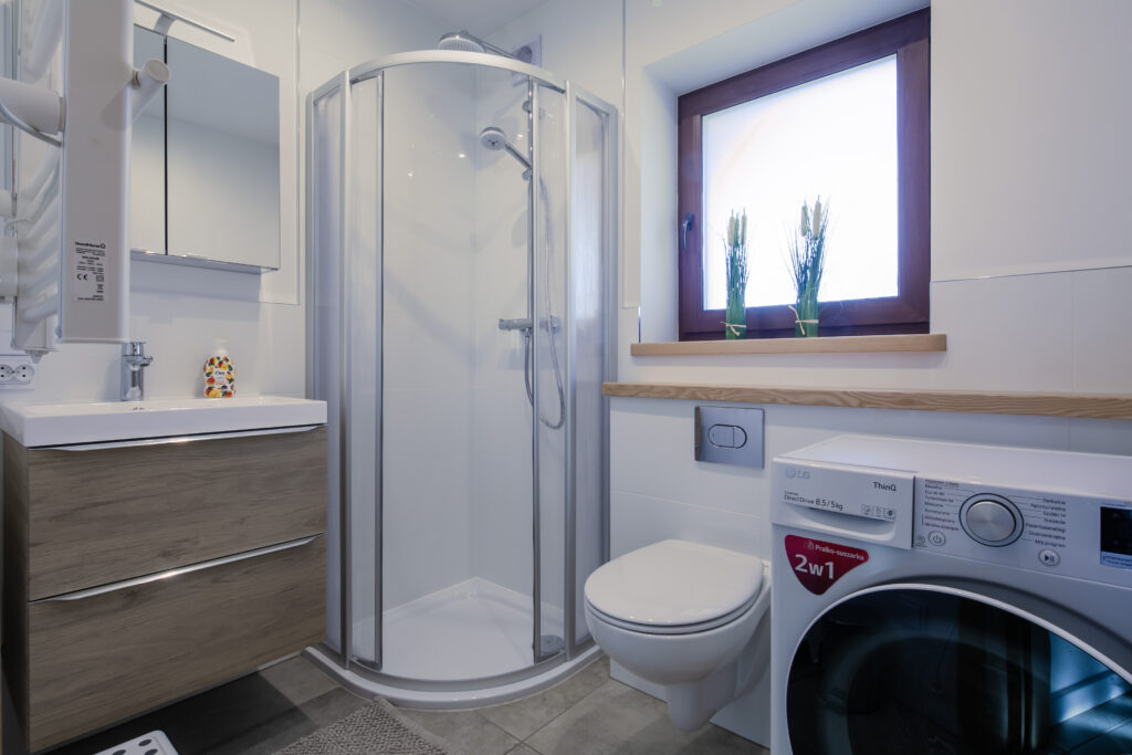 Łazienka: kabina prysznicowa, umywalka, toaleta, pralka, suszarka do włosów.