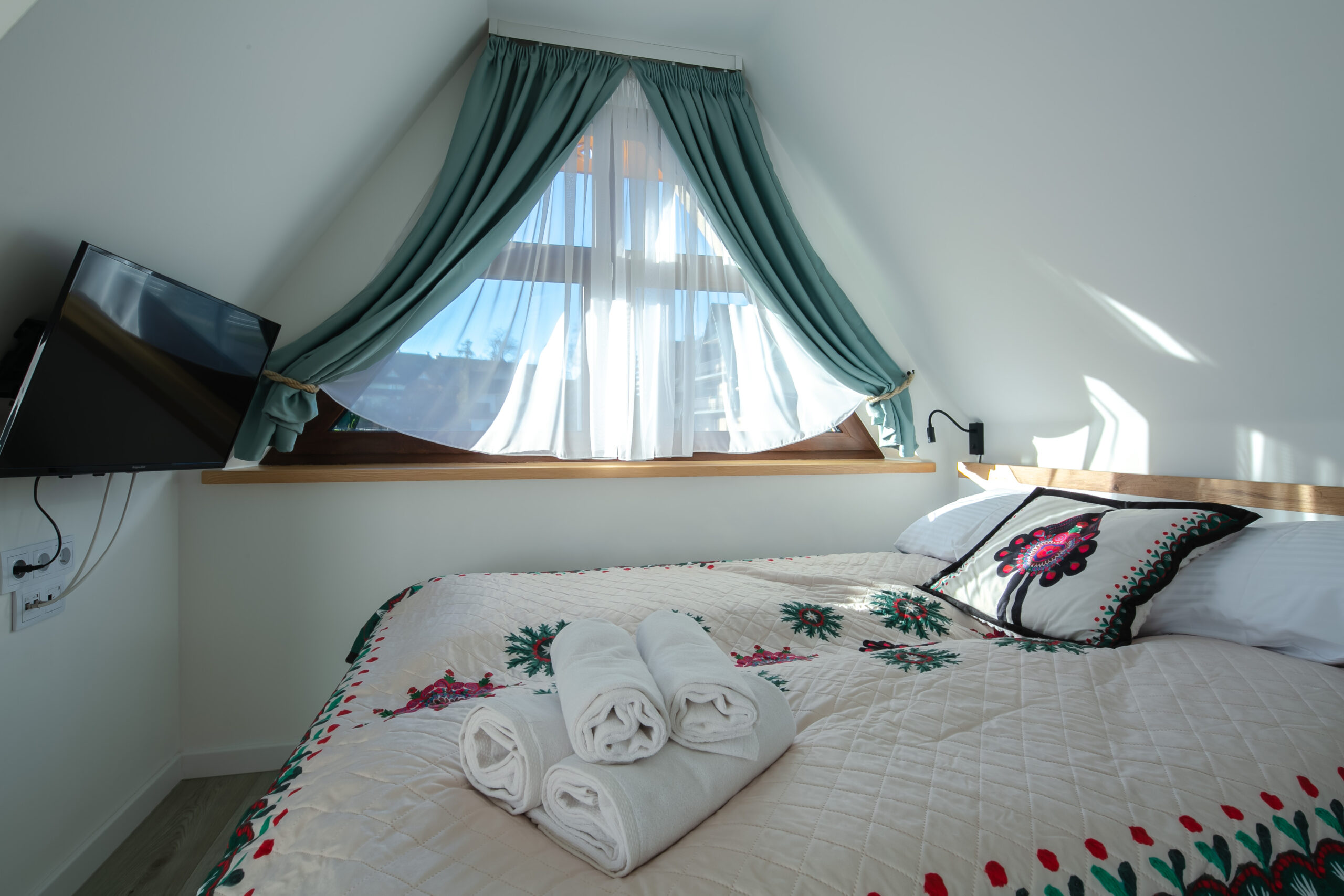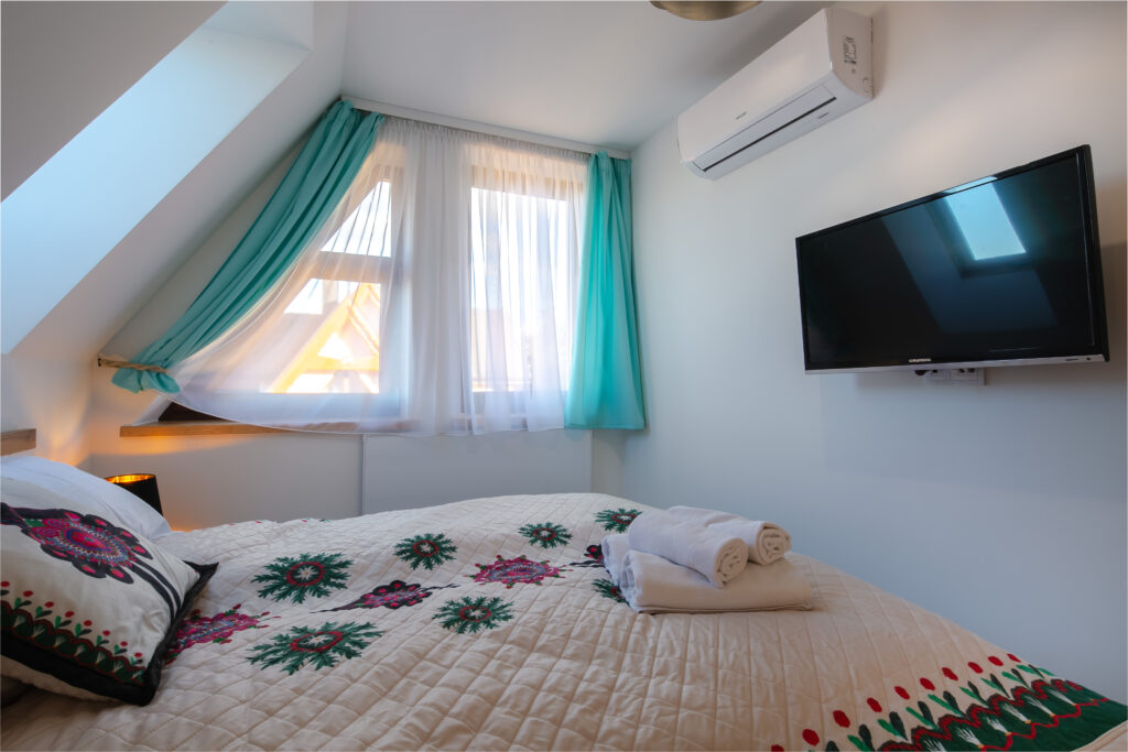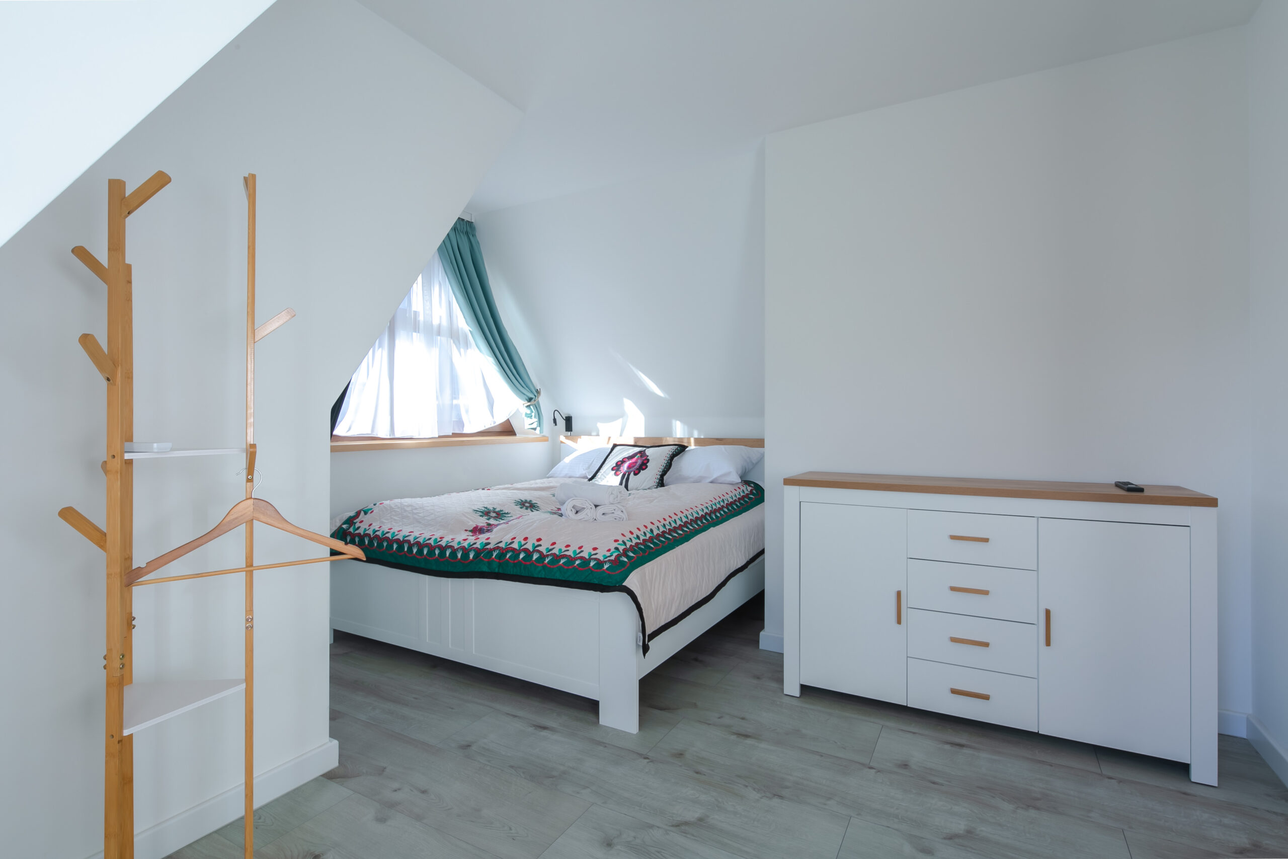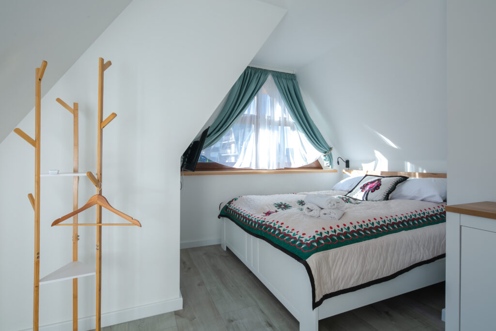 Sypialnia 2 (piętro): łóżko małżeńskie, TV’37, smart TV, komoda, wieszak, balkon (widok na góry)