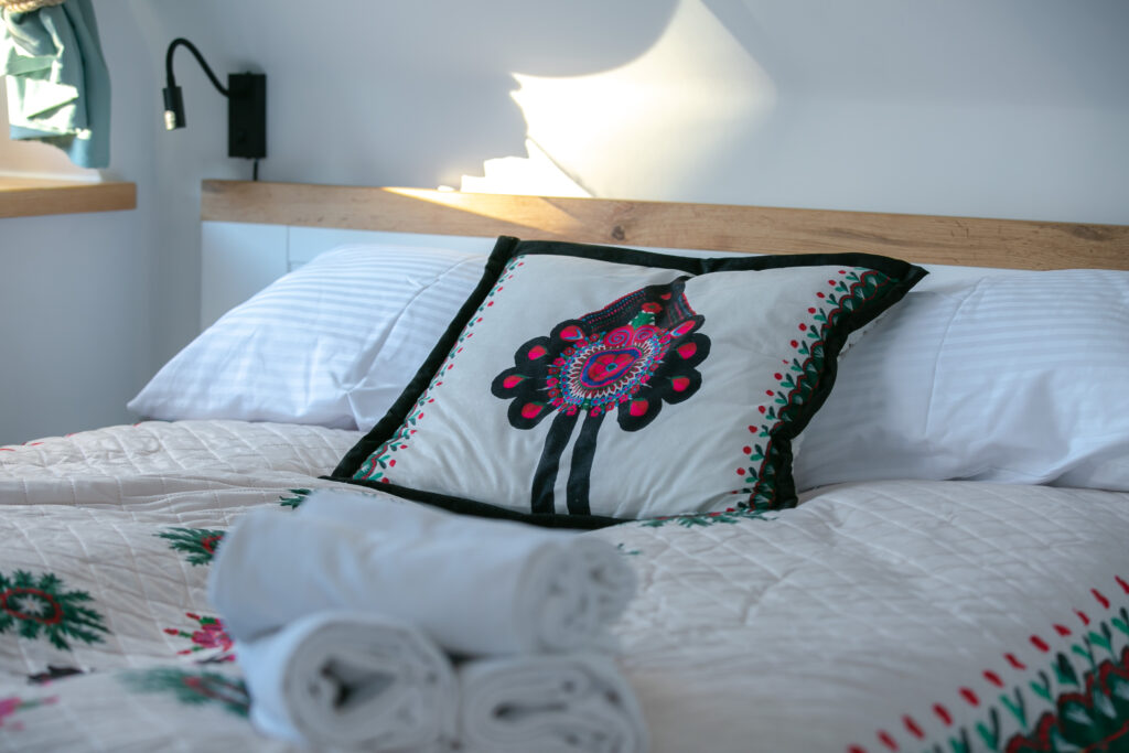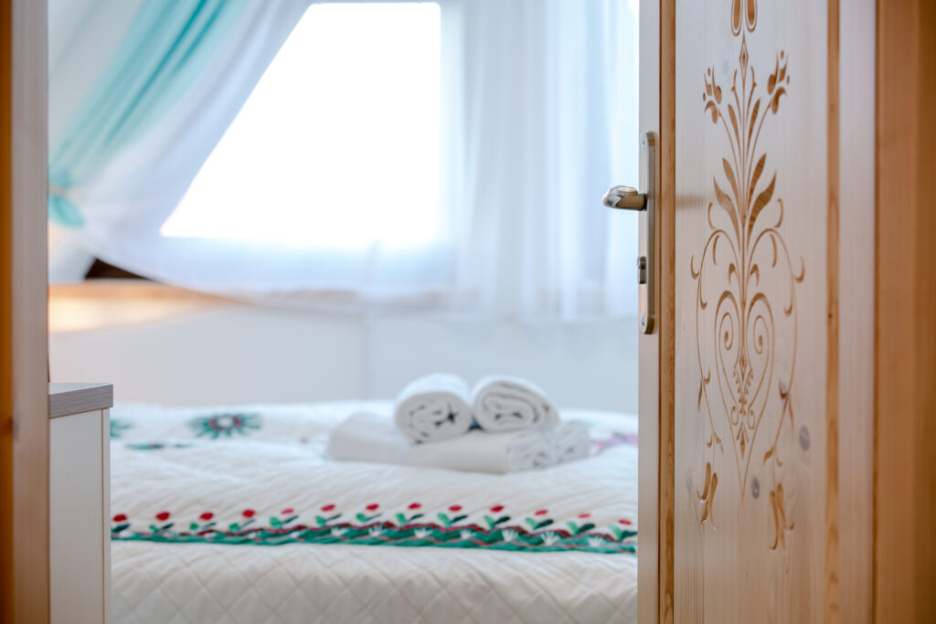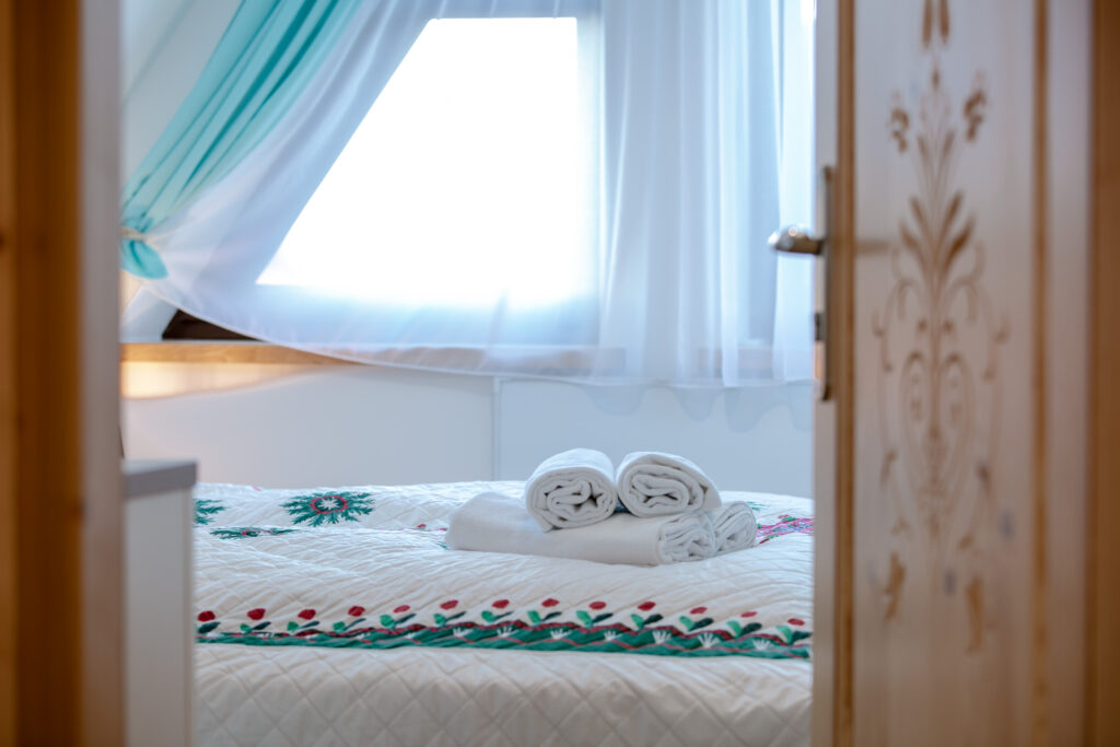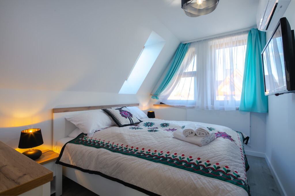 Uwaga! Domek przeznaczony jest dla komfortowego wypoczynku 6 osób, ale istnieje możliwość 2 dostawek – na 3 kondygnacji znajdują się materace do spania (opcja dodatkowo płatna).