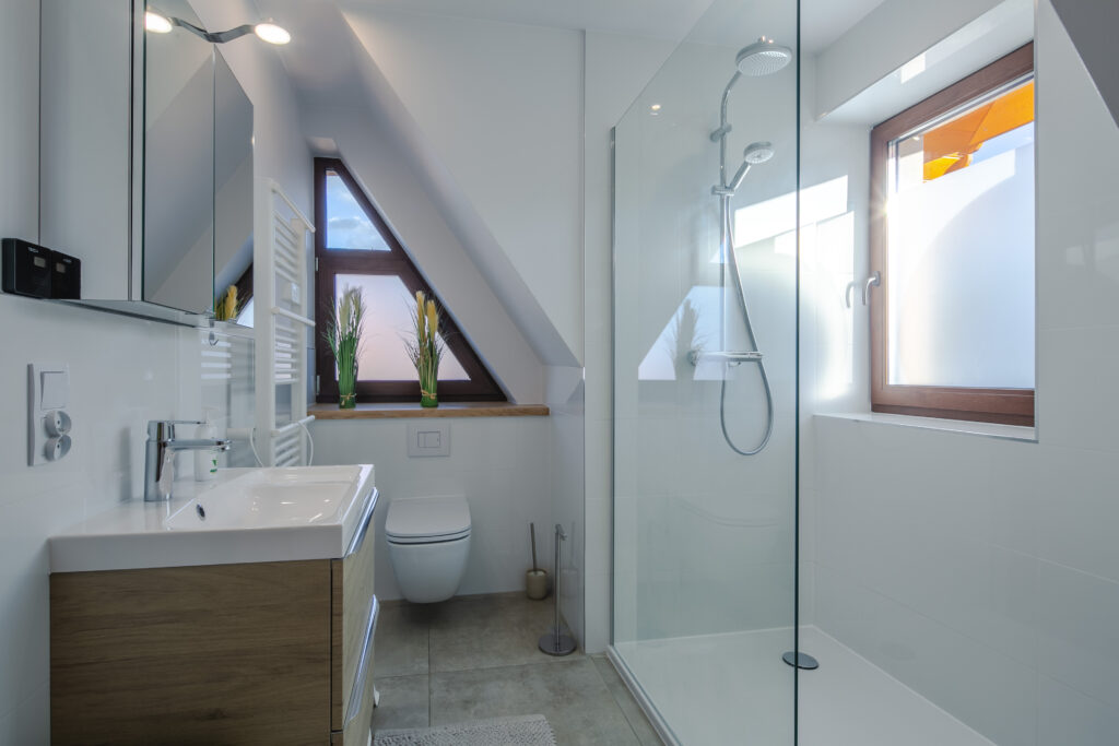 Łazienka (piętro): kabina prysznicowa, toaleta.